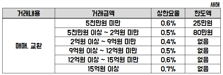 매매 시에는 거래금액, 상한요율이 전세 때와는 달라집니다. 매매하게 되면 전세나 월세보다 금액이 커지기 때문에 부동산 복비도 부담스러워지기도 합니다. 따라서 매매 시에는 특히나 사전에 부동산과 상한요율 내에서 중개수수료를 협의하는 것이 필요합니다. 하지만 모든 부동산에서 협의를 해주는 것이 아니기 때문에 상황에 따라 정중하게 협의해보시고, 되지 않는다면 깔끔하게 거래하는 것도 좋은 방법일 수 있습니다.