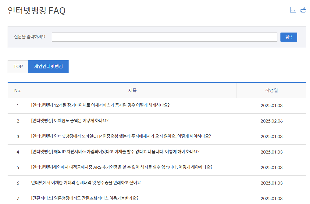 고객센터가 운영하지 않는 토요일, 일요일, 공휴일의 경우 자주하는질문의 답변을 통해 오류 해결방법을 찾아볼 수 있습니다. 이체한도증액, 모바일 OTP 인증, 이체서비스 등 관련한 세부 내용들을 자주묻는질문에서 모두 다 확인하실 수 있습니다.