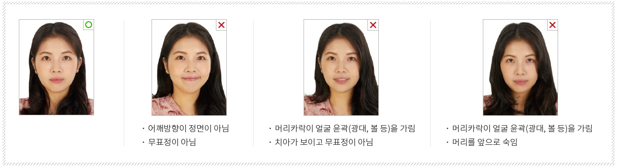 머리가 사진 중앙에 있으며, 얼굴과 어깨는 모두 측면이 아닌 정면을 향해야 합니다. 얼굴만을 가까이 근접하거나 머리를 앞, 뒤로 기울인 사진은 사용이 불가합니다. 입은 치아가 노출되지 않도록 다물고 미소나 눈썹의 변화가 없는 무표정으로 촬영해야 합니다.머리카락으로 눈썹, 눈, 얼굴윤곽(광대나 턱)을 가리는 사진은 안됩니다. 즉 앞머리는 없앤 채 찍어야 합니다. 얼굴 전체가 가려지지 않고 완전히 노출되는 것이 중요합니다.