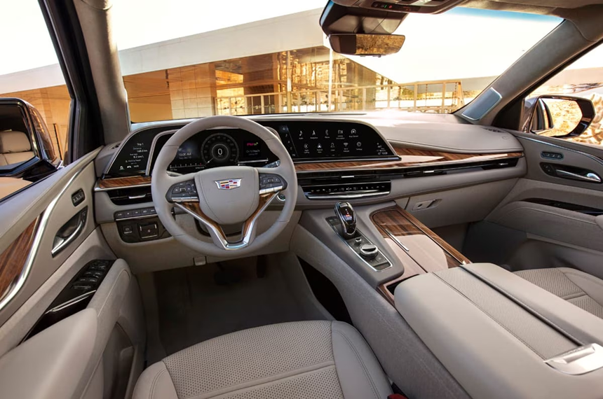 차 자체가 크다보니 실내 공간도 여유가 있고 넉넉합니다. 캐딜락 에스컬레이드는 업계 최초 38인치 커브드 OLED 디스플레이를 갖췄는데 이는 4K급 TV보다 2배 이상 개선된 화질입니다.