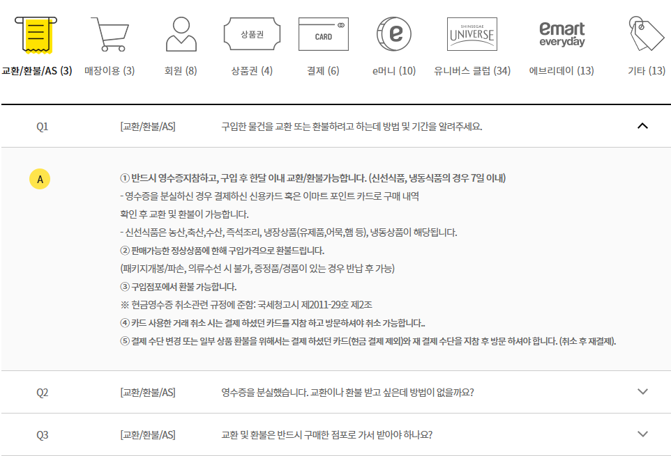 이마트 고객만족센터 운영시간이 아닐 때는 자주 묻는 질문에 대한 답변을 통해 교환, 환불, 상품권 등과 관련된 문의에 대한 답을 얻을 수 있습니다. 구입한 물건에 대한 교환, 환불 기간과 방법 뿐만 아니라 영수증 분실 시, 구매한 점포에서 환불을 받아야 하는지 등 다양한 내용에 대한 답변이 기입되어 있습니다.
