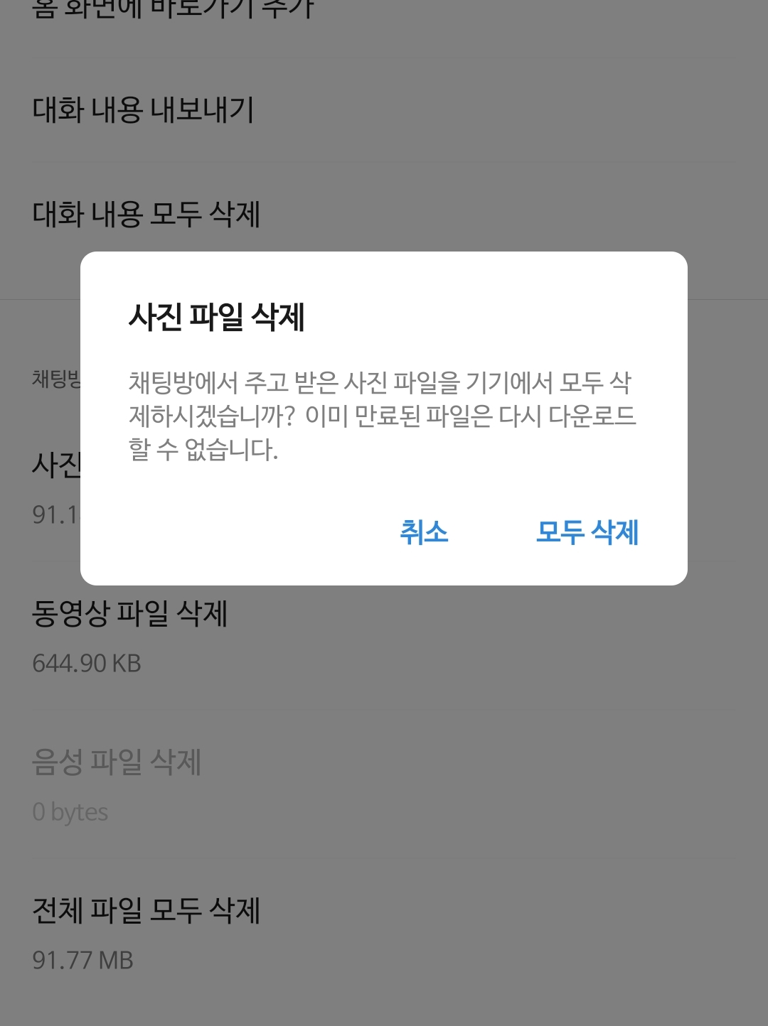 2. 톱니바퀴 채팅방 설정으로 들어간 뒤 맨 아래로 내리면 사진 파일 삭제, 동영상 파일 삭제, 음성파일 삭제가 있습니다. 여기서 용량이 큰 것만 삭제해주셔도 되며 전체 파일 모두 삭제를 진행해도 됩니다.