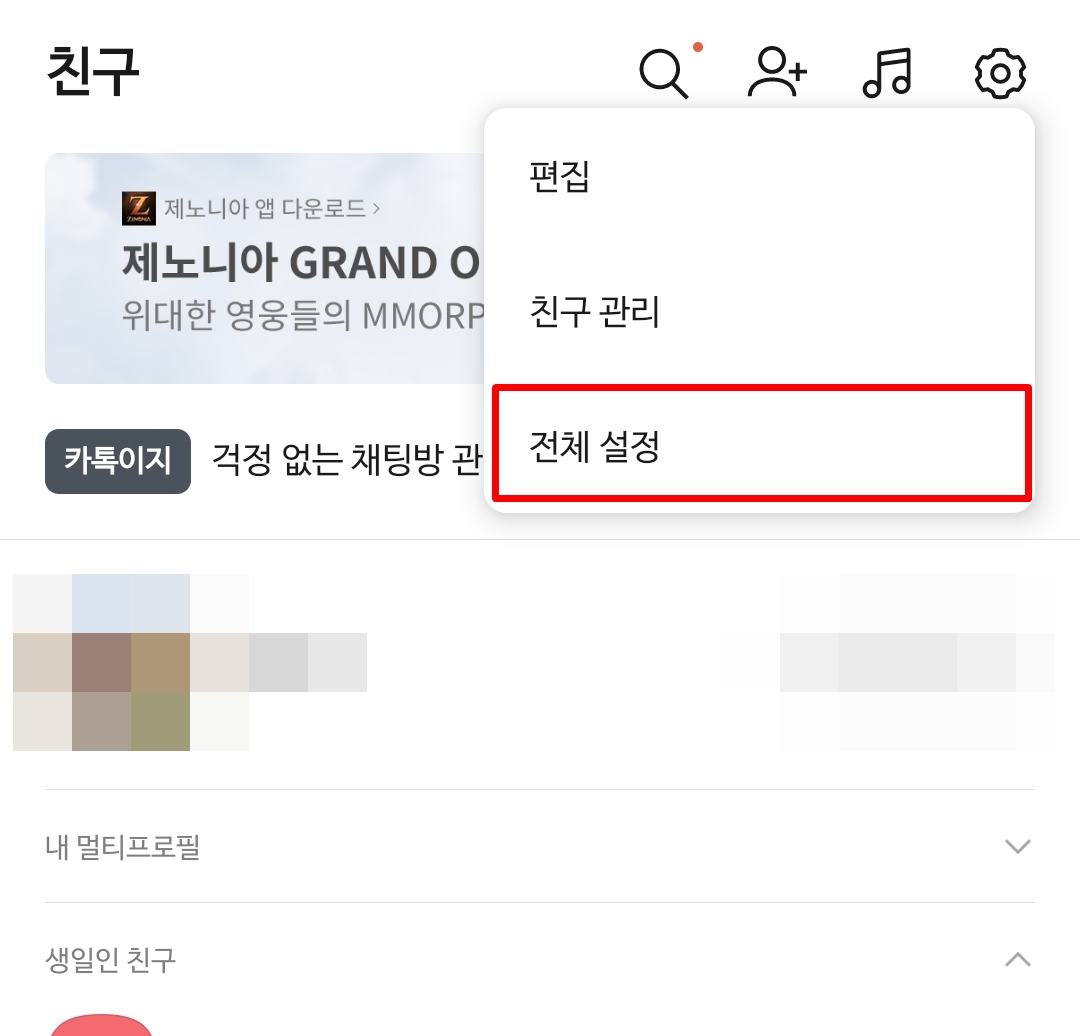 1.카카오톡에 들어간 뒤 우측 상단에 있는 톱니바퀴 모양을 눌러줍니다. 톱니바퀴를 눌러 나오는 편집, 친구관리, 전체설정 중 전체설정으로 들어갑니다.
