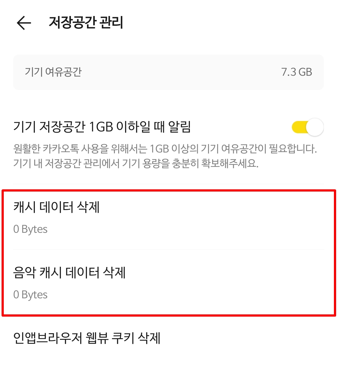 3. 저장공간 관리에 있는 캐시 데이터 삭제, 음악 캐시 데이터 삭제를 진행합니다. 캐시 데이터 삭제는 채팅방에서 주고 받은 사진, 동영상, 음성 메시지에는 영향을 주지 않습니다.