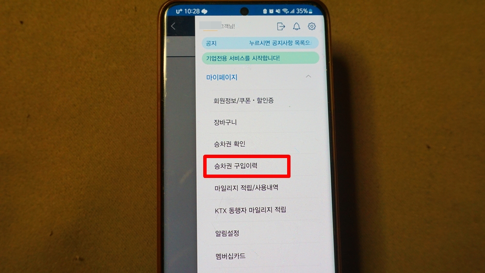 2. 메뉴바 접속 후 보이는 메뉴들 중 KTX 영수증 발급을 위해 승차권 구입이력을 눌러줍니다.