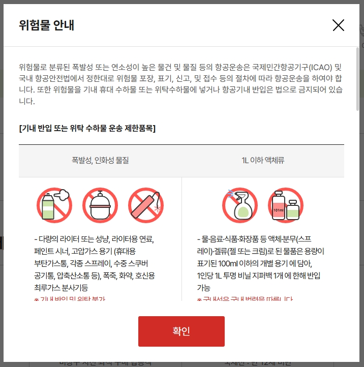 5. 좌석 선택 전 위험물 안내와 온라인체크인 이용 제한에 대해 미리 확인합니다.