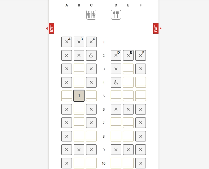 엑스 표시 되지 않은 좌석은 모두 선택이 가능합니다. 비상구, 화장실 등의 위치를 확인하여 원하는 좌석을 선택해볼 수 있습니다.