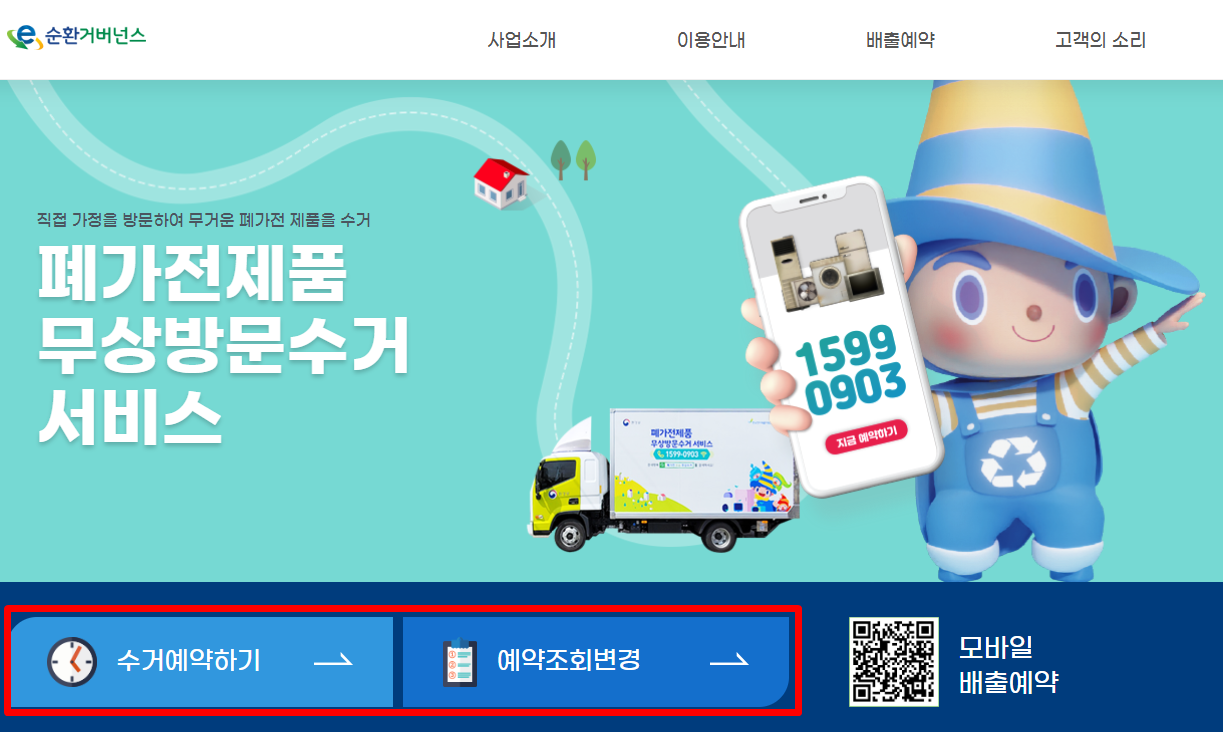 선풍기, 청소기, 에어프라이어 등 폐가전이 발생한 경우라면 폐가전무상배출예약시스템▶에서 배출예약을 진행하면 됩니다. 폐가전제품 무상방문수거 서비스를 신청하기 위해 순환거버너스(15990903)에 접속하면 됩니다.