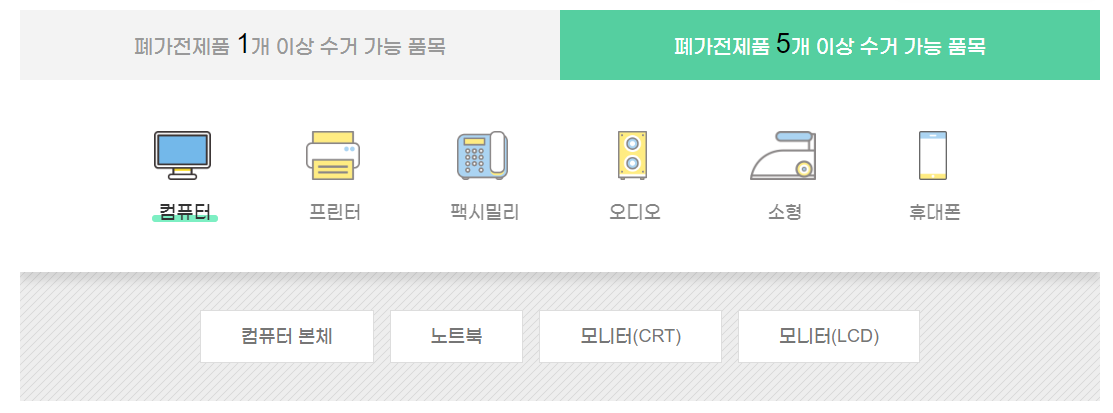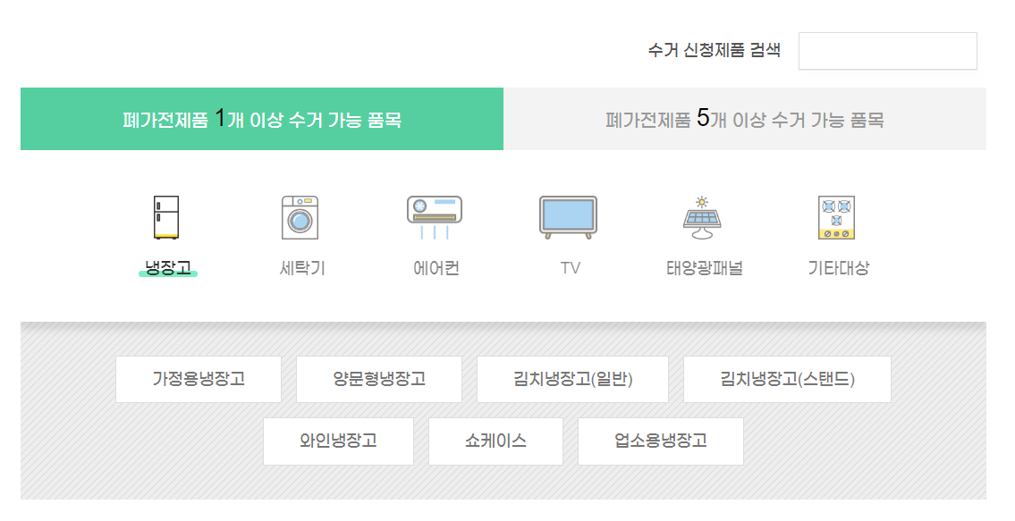폐가전 제품의 경우 수량이 1개만 되더라도 수거 가능한 품목이 있고, 5개 이상이 되어야 수거 가능한 품목이 있습니다.