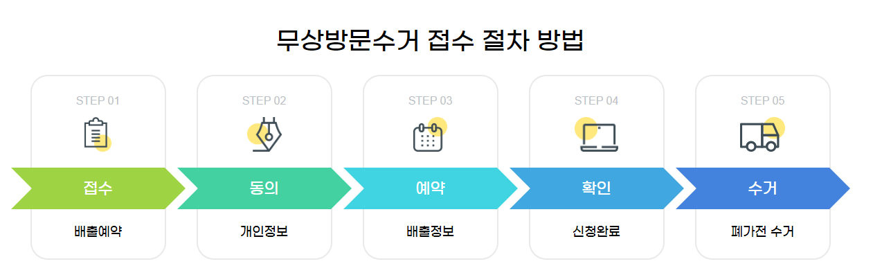 폐가전 무상방문수거 접수 절차 방법은 배출 예약 후 개인정보, 배출정보를 입력하면 신청이 완료됩니다. 이후 폐가전 수거를 진행합니다. 간단한 방법으로 폐가전 무료 배출을 진행할 수 있습니다.