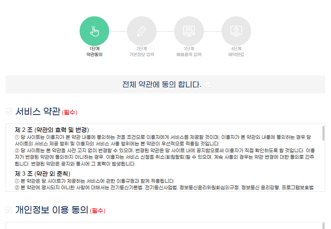2. 수거 예약하기를 눌러 약관 동의, 기본정보 입력과 배출품목을 입력하면 예약이 완료됩니다.