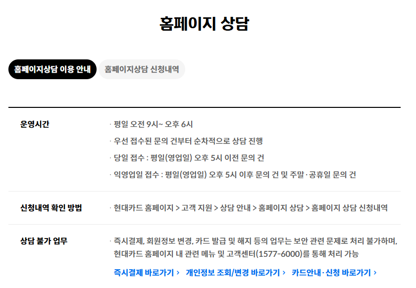 현대카드 고객센터 전화연결이 어려운 경우 홈페이지 상담도 가능합니다. 홈페이지 상담은 평일 오전 9시부터 오후 6시까지입니다.