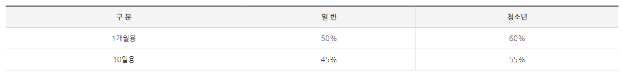 일반용 SRT정기승차권은 1개월 50% 할인이 되며, 10일용 45% 할인이 됩니다.