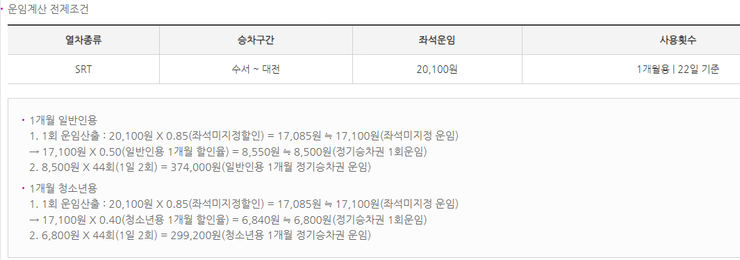 * 정기권 운임 산식 = (기준운임 * 좌석미지정할인율) * 정기권할인율 * 운임계산 횟수