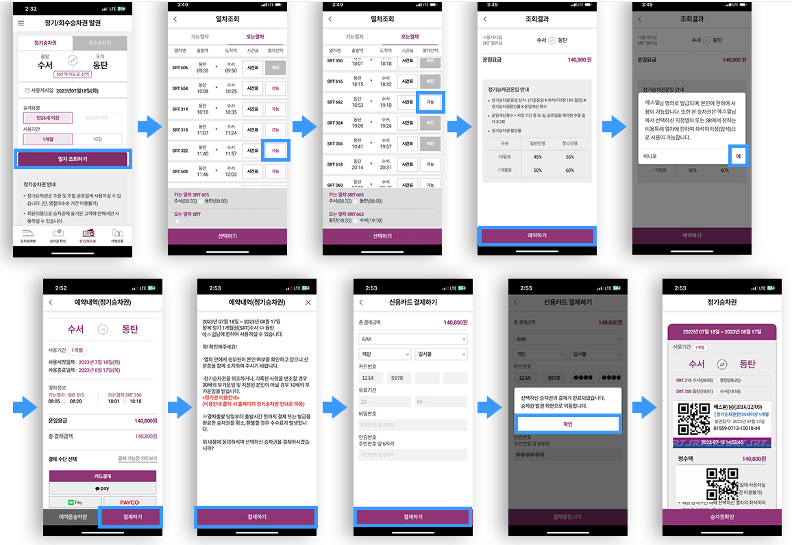 SRT정기권 구매 방법 외에도 매진 시 구매가능일자 확인방법, SRT정기승차권 확인 및 환불 방법 등에 대해서도 모두 확인이 가능합니다.